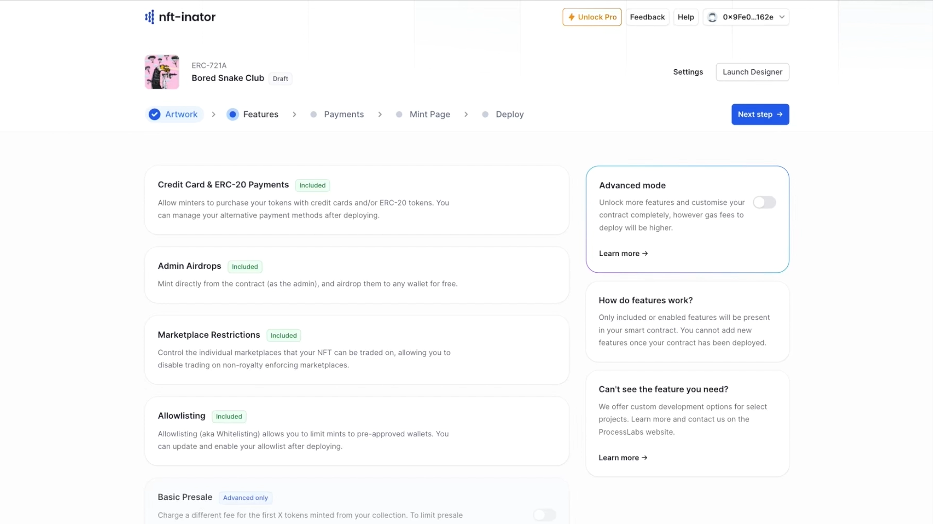 Count on NFT-Inator contracts to have every feature you need. There's almost too many to cover, but here's a few of our favourites: